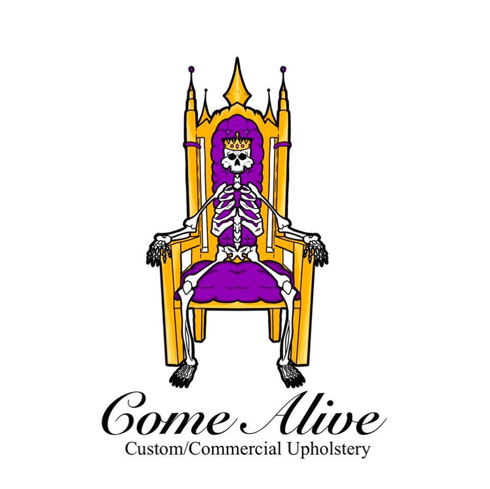 Images representing the brand identity of "Come Alive Upholstery." From a skeleton on a throne to a skeleton sewing with vintage machine, these images capture the unique and memorable brand identity of the upholstery business.